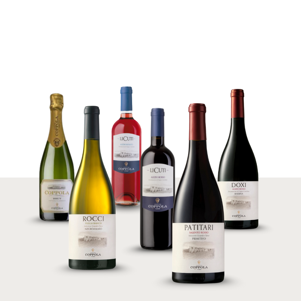 Le confezioni di vino pugliesi I Classici Coppola racchiudono l’essenza del Salento in un percorso di gusto che esplora i vini simbolo di Cantina Coppola. Disponibili in versione da 6 o 12 bottiglie, queste selezioni offrono un equilibrio perfetto tra eleganza, tradizione e autenticità.